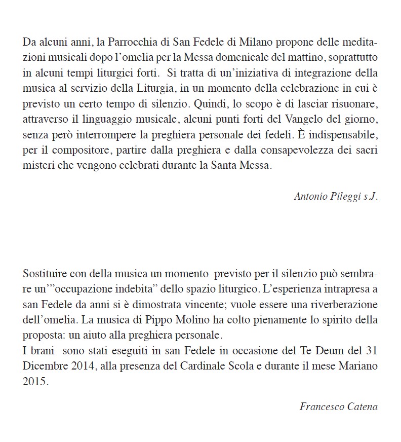 Sostituire con della musica un momento previsto per il silenzio può sembrare un’”occupazione indebita” dello spazio liturgico. L’esperienza intrapresa a san Fedele a Milano da anni si è dimostrata vincente; vuole essere una riverberazione dell’omelia. La musica di Pippo Molino ha colto pienamente lo spirito della proposta: un aiuto alla preghiera personale.