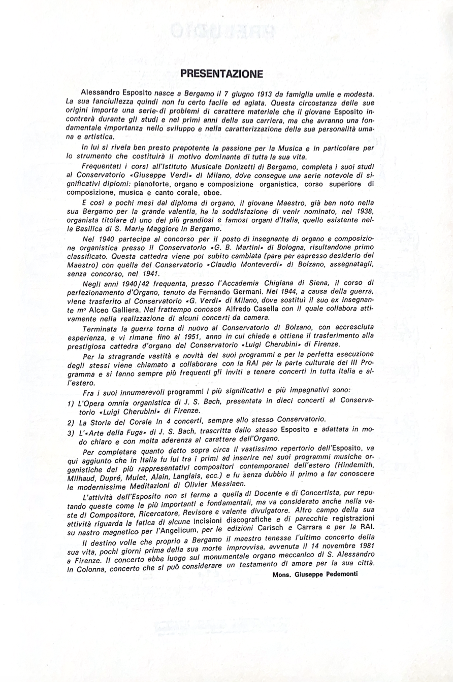 Nella collana “Composizioni per organo”, una raccolta dedicata al compositore Alessandro Esposito, musicista che si distingue per la sua sincerità poetica e per il tasso di raffinata scuola che emerge dalle sue composizioni. In questo volume, nei 23 brani per organo, si ritrovano insieme il piccolo fiore musicale, il brano toccatistico di forte impegno e la severa fuga su un tema.
