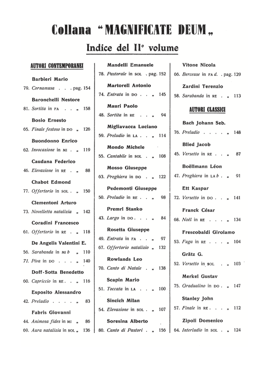 Questa storica collana in 27 volumi, che può e deve essere considerata il vademecum di tutti gli organisti, l’indispensabile per gli allievi e i dilettanti, la didattica economica per i seminari e i monasteri, il testo ausiliario per le scuole ceciliane, è da sempre accolta con entusiasmo ove vi sia un’anima sensibile che ama educarsi nella musica sacra, per dedicare la “parte migliore” del suo tempo al servizio divino.