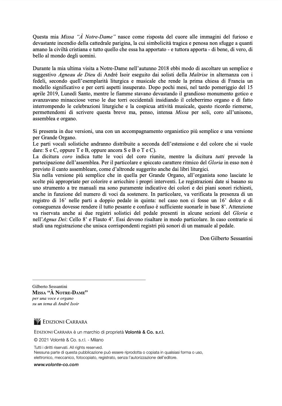 Questa mia Missa “À Notre-Dame” nasce come risposta del cuore alle immagini del furioso e devastante incendio della cattedrale parigina, la cui simbolicità tragica e penosa non sfugge a quanti amano la civiltà cristiana e tutto quello che essa ha apportato – e tuttora apporta – di bene, di vero, di bello al mondo degli uomini.