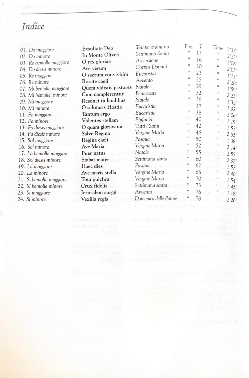 Quindi troviamo anche l’occasione di leggere una raccolta che trattiene in sè valori didattici ed una profondità che si rivela con pienezza nel gioco armonico-contrappuntistico. In questo senso il compositore ha voluto pensare anche alle classi di Esercitazioni Corali dei Conservatori, agli Istituti Musicali Pareggiati e a quelle scuole diocesane dove il respiro didattico tenga conto dell’ensemble capace di ornare la moderna liturgia.